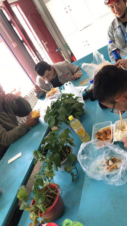 中午時分,辛苦的工作人員狼吞虎咽般的吃著熱乎乎的飯菜