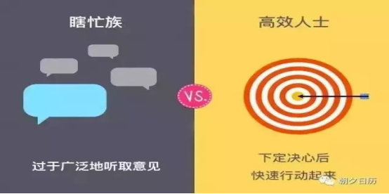 瞎忙族和高效的人的時(shí)間都安排得很滿,但是卻有本質(zhì)的區(qū)別。瞎忙族是沒有目標(biāo)和方向的忙碌,整天被外部力量推著趕著,永遠(yuǎn)有忙不完的活,永遠(yuǎn)在救火,但是卻說不上來忙了些啥,為了啥。而高效的人的一個(gè)共同特點(diǎn),就是對自己的人生有清晰的規(guī)劃,永遠(yuǎn)知道自己的目標(biāo)是什么,每一個(gè)階段的奮斗有什么意義。他們的忙碌是充實(shí),而不是庸碌。