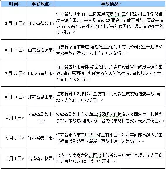 “3·21”特別重大爆炸事故發生以后,安全事故并沒有由此停歇,并再度頻繁上演。接連的爆炸事件引起政府和群眾的高度重視,事故發生后全國在化工領域開展危化品密集式排查,化工行業整治力度再上臺階。作為本輪事故多發地的江蘇省,亦于4月1日出臺史上最嚴的整治方案:要求到2020年底,江蘇省化工生產企業數量減少到2000家,到2022年,全省化工生產企業數量不超過1000家。4月5日,江蘇鹽城決定徹底關閉響水化工園區,鹽城這一舉措,外界認為無疑于是“壯士斷腕”。