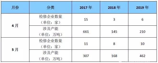 表1 2017-2019年4-5月燒堿檢修廠家及涉及產能統計表
