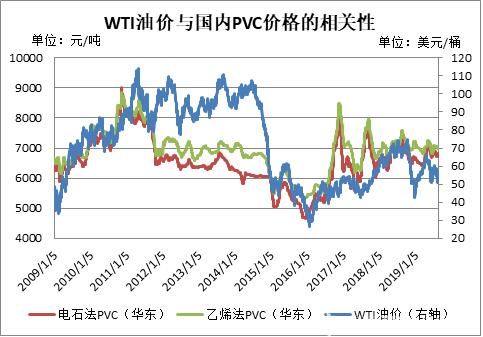國內(nèi)PVC的生產(chǎn)工藝主要有兩種。一是電石法,主要生產(chǎn)原料是電石、煤炭和原鹽;二是乙烯法,主要原料是石油。國際市場上PVC的生產(chǎn)以乙烯法為主,而國內(nèi)受富煤、貧油、少氣的資源稟賦限制,則以電石法為主。截至2018年底,國內(nèi)PVC產(chǎn)能為2404萬噸,其中電石法PVC產(chǎn)能為1962萬噸,乙烯法PVC產(chǎn)能為442萬噸,電石法產(chǎn)能和乙烯法產(chǎn)能的占比分別為81.6%和18.4%。由于電石法PVC占據(jù)主導地位,原油價格的變化對國內(nèi)PVC影響較小。統(tǒng)計顯示,2009年1月至2019年11月,華東市場電石法PVC和乙烯法PVC與WTI油價的相關(guān)系數(shù)分別為0.42和0.51,相關(guān)性并不高。