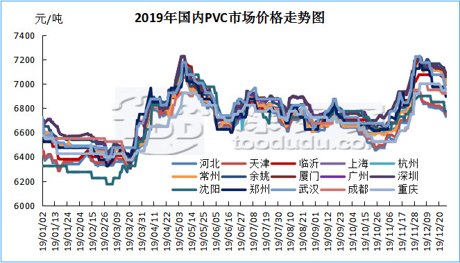 2019年中國國內PVC市場仍舊是價格高位整理的一年,全年價格波動區間以華東主流為例在6440-7225元/噸之間,高低價差785元,從走勢圖以及月均價走勢可以看出,2019全年經歷兩撥較大幅度的推漲,其中第一季度1-3月份市場較為低迷,處于低谷整理期,4月份開始市場價格開始緩慢上漲,經歷不斷的上漲價格在5月中旬開始達到年內第一次高點,價格達到高點后,需方承受能力有限,價格開始下行,下行至6月中下旬后,市場開始進入緩慢的整理期,長達4個月,6月中下旬-10月中旬,價格一直處于小幅震蕩整理中,供需雙方的博弈一度令PVC整體產業鏈進入迷茫期,多數行業內人士甚至認為PVC產品的下跌大周期開始來臨,我們回顧下往年的PVC行情,其價格在15年5月初達到最低點后內蒙出廠4350元/噸含稅,價格在歷史低點后開始不斷反彈,在經歷了16-18年的整理后,在19年中國國內PVC市場仍占據高點,四年間PVC生產企業賺的盆滿缽滿。但下游制品企業卻苦不堪言,并且自18年國家稅控改革以來,次終端貿易商對稅票逐漸失去控制,導致次終端利潤不斷下滑,規范的市場導致票貨分離減少。而在整個PVC產業鏈中,生產企業占據越來越多的話語權,從而導致了雖然我們看到在迷茫期過后,第四季度國內PVC市場仍舊迎來年底第二次大漲,此次上漲把PVC價格推上了真正的年底高點。第四季度的上漲導火線為內蒙企業裝置出現意外事件停產,市場炒作聲漸起,價格開始上漲,而隨后的11-12月份,在期貨的帶動下,價格不斷被推上新高。12月中旬需方面對如此高的價格開始產生抵觸心理。而此時的年度備貨來臨,市場不但沒有復漲反而開始進入蕭條期,價格開始下滑。