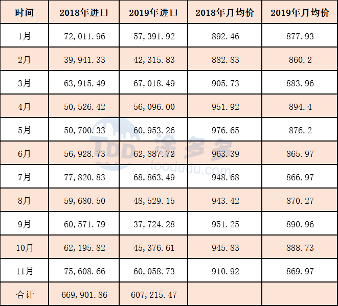 2019年1-11月累計進口數量為607215.47噸,同比去年減少62686.39噸。跌幅9.36%,國內產能供給充裕,進口量大幅下跌。
