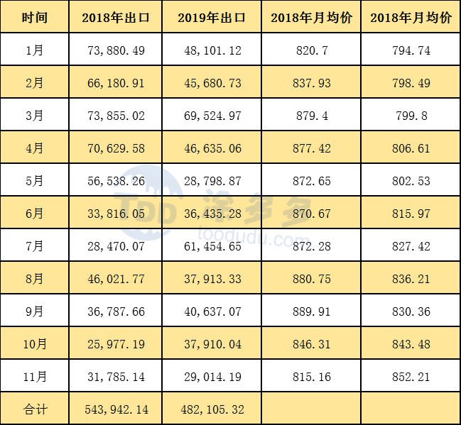 2019年1-11月累計出口數量為482105.32噸,同比去年減少61836.82噸。跌幅11.37%,進出口抵消來看,國內市場供需變化不大。出口數量的減少彌補了進口的減少。