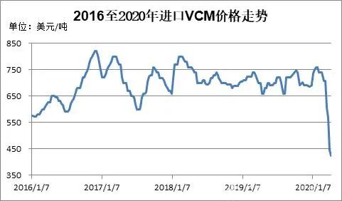 在需求增長和美國頁巖氣革命的推動下,近年來,全球乙烯行業(yè)進入新一輪擴能高峰期,供應(yīng)趨向?qū)捤桑蚁┦袌鲞\行中樞下移。油價暴跌,乙烯的成本端支撐塌陷,乙烯市場加速下跌,乙烯法PVC的生產(chǎn)成本進一步下降。截至2020年4月上旬,亞洲乙烯CFR東北亞報405至415美元/噸,較年初下跌逾40%。全球VCM市場供需相對平衡,價格波動幅度較小。2018年至2020年初,亞洲乙烯CFR東北亞價格大體在650-800美元/噸之間震蕩。受油價下跌影響,VCM價格大跌,2020年4月上旬,亞洲乙烯CFR東北亞報423-425美元/噸,較年初下跌近40%。