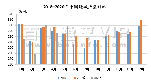 根據(jù)百川統(tǒng)計(jì)數(shù)據(jù),2020年1-6月燒堿折百產(chǎn)量約1685.7萬(wàn)噸,同比下滑2.9%。