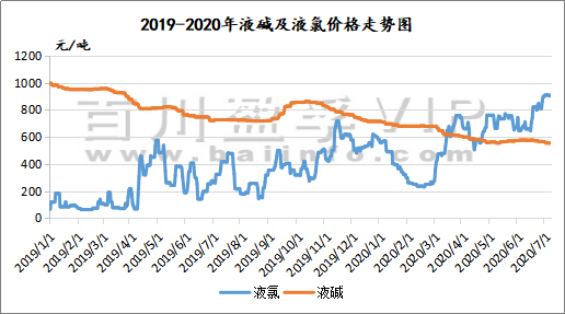 今年氯堿綜合利潤(rùn)不高,燒堿盈利微薄,且局部地區(qū)始終倒掛,“以氯補(bǔ)堿”的情況比較明顯。我們將主產(chǎn)區(qū)山東、江蘇槽車出貨價(jià)格進(jìn)行分析發(fā)現(xiàn):2020年山東地區(qū)液氯價(jià)格保持在500-800元/噸調(diào)整,500元/噸基本為山東液氯托底價(jià)格。2020年1-6月份山東地區(qū)液氯槽車出貨均價(jià)為487.09元/噸,同比2019年山東地區(qū)液氯槽車出貨均價(jià)82.3元/噸上漲491.84%。而江蘇地區(qū)液氯出貨價(jià)格在350-800元/噸之間調(diào)整,350元/噸基本為江蘇液氯托底價(jià)格。2020年1-6月份江蘇地區(qū)液氯槽車出貨均價(jià)為603.3元/噸同比2019年江蘇地區(qū)液氯槽車出貨均價(jià)229.4元/噸上漲162.99%。
