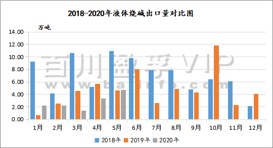 如圖所示,2018-2020年我國(guó)液堿出口量逐年下滑,2020年上半年受全球公共衛(wèi)生事件影響,我國(guó)進(jìn)出口貿(mào)易受到嚴(yán)重制約,液堿出口量同比下滑明顯,絕大部分貨源需轉(zhuǎn)向國(guó)內(nèi)市場(chǎng)消化,國(guó)內(nèi)市場(chǎng)消化情緒亦不佳,市場(chǎng)持續(xù)低迷。