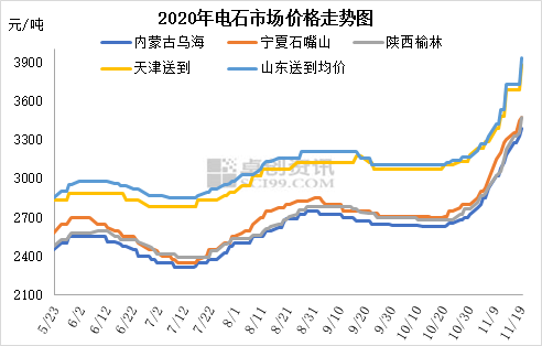 整體市場描述:上周五至今電石價格繼續(xù)快速上漲,各地采購價連續(xù)上調(diào)300-400元/噸,電石出廠價上調(diào)200元/噸左右,且烏海及周邊貿(mào)易出廠價推出了明日繼續(xù)上漲100元/噸計劃。至此,10月下旬至今,電石價格已連續(xù)上調(diào)了700-800元/噸,達(dá)到2011年9月以來的最高水平。本周電石價格仍在繼續(xù)上調(diào),主要仍因供需失衡,貨源緊俏推動。內(nèi)蒙古地區(qū)電石仍頻繁有不同程度的限電現(xiàn)象,產(chǎn)量不足,寧夏石嘴山地區(qū)受重污染天氣影響,本周后期有電石爐降負(fù)荷現(xiàn)象,外加其它復(fù)工電石爐恢復(fù)緩慢,電石增量較為有限;但PVC價格仍在連續(xù)上漲,前期停車PVC企業(yè)也有復(fù)產(chǎn),整體開工高位,部分甚至超負(fù)荷運行,外加冬季來臨前對電石也有補庫需求,整體需求維持高位,綜合導(dǎo)致電石貨源持續(xù)緊張,價格得以連續(xù)上揚。