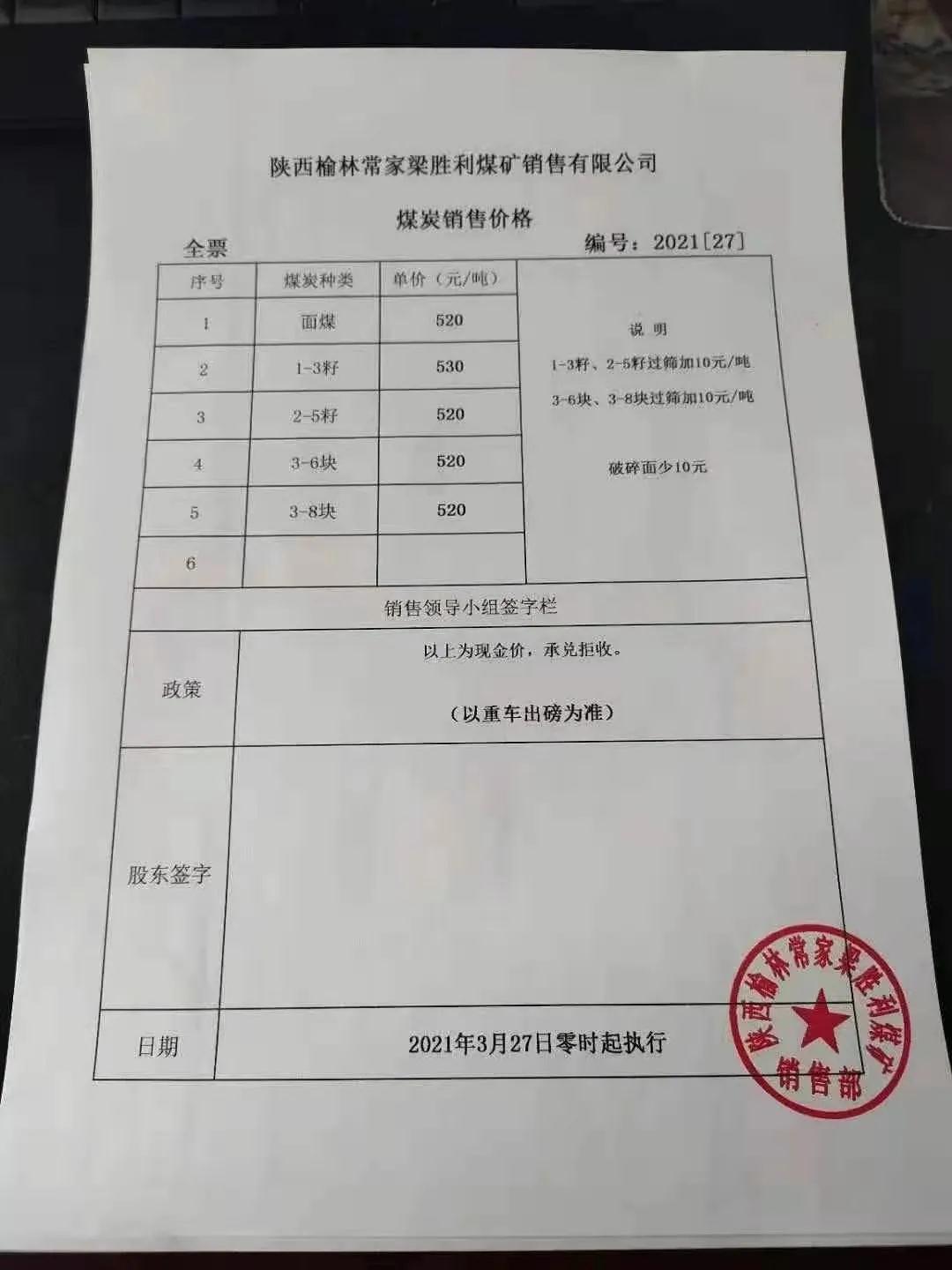 府谷縣老高川鄉恒益煤礦3月27日上午10:00:00時起,面煤、次精煤、二五籽、四九塊各漲價10元/噸。
