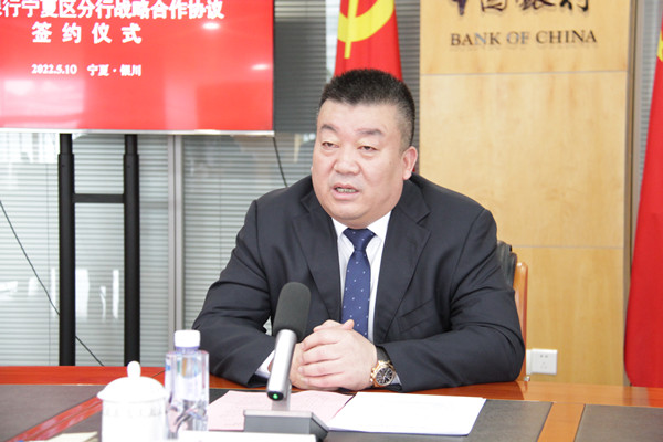 中國銀行寧夏分行行長黨委書記、行長肖達致辭。他對金昱元化工集團和中國銀行寧夏分行產業鏈發展項目戰略合作協議簽約表示熱烈祝賀,他表示,簽約后,中國銀行寧夏分行將一如既往,盡銀行所能,為金昱元化工集團項目建設給予資金上的大力支持,并預祝簽約圓滿成功。